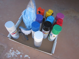 Because Big Blue is a few years old and has spent her life in Arizona, the bright blue paint job is a bit faded, I couldn't really find a blue that matched. I also didn't trust I could do a decent job having no experience with spray paint. Solar guy kept assuring me it doesn't matter. No one sees the top. Hmmm...well, if that's the case then why not have some fun and do a wild, multi-colored pattern? Flowers? I love flowers. I visited several auto supply stores and Home Depot to ask questions about paint, process and durability. I ended up buying a whole lot of colorful Rustoleum paint from a Home Depot that had really knowledgeable workers!